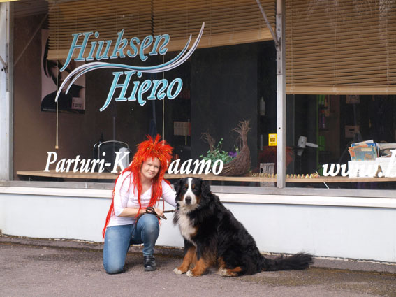 Mun vetämän puuhislenkin kunniaks valtakunnassa verettiin liput salkoon. Oli nääs kansallinen veteraanipäivä. Mää olin lenkkitiarotteessa luvannu, että näytän kaikki reitillä olevat lätäköt, purot ja muut kosteikot. Vauhtia riitti ku Iira, Jeri, Maassa, Simpa, Taiska ja mää (Iida, Jedi, Mascha, Simba, Taiska ja Donna, suom.huom) tutustuttiin Mätäkivenmäen ympäristön vesistöihin. Oli nääs semmonen jenki koossa, ettei kukaan ainakaan vettä pelänny. Urospernitki oli tosi herrasmiähiä, kaikki vastakkaisen sukupualen erustajat sai nääs lenkkeillä ja touhuta täysin rauhassa. Riamukkaan lenkin jälkeen lährettiinki sitten kaikki valmisteleen vapun viattoo. Siitä tässä esimerkkinä iskän hoviparturin ja mun rokkimimmit-kuva. Itte mää noissa oman turkkini siistimisasioissa luatan erelleen Hilkan salonkiin.