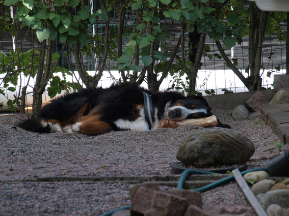 Seuraavalla viikolla äiskä ja iskä lähti Parselonaan. Siä ku lämpötila huiteli kolmessakymmenessä selsiuksessa, ni mää päätin jäärä kotikulmille ja pääsinkin taas Saskan luakse kortteeraan. Juhan kanssa meillä oli semmonen piäni kilpailu. Juha nääs teki klapeja, jotka se sitten kanto varastoon sateensuajaan. Mää olin vahvasti sitä miältä, että ne valmiit klapit olis ollu viisaampaa jättää vaan siihen pihalle säiren armoille. Sen takia mää raijasin siältä varastosta niitä klapeja sitä mukaa takasin ulkotiloihin, ku Juha kanto niitä sisälle. No, loppujen lopuks mää annoin Juhan voittaa ja se sai kaikki lämmöntuattajat pinottua varastoon. Saska osallistu tähän kisaaan ainoostaan pualueettomana sivustakatsojana, se ku ei varmaan oikeen tiänny kumman pualelle se olis asettunu. Toinen juttu mistä mää en kyä valita, mutta kyä se pikkasen kyrsi. Nääs nääs, normaalia arkee ku siinä Saskan lauman kanssa elettiin, ni aamulenkit alko suunnilleen kello kuuren paikkeilla. Määhän oon tottunu niihin kellonlyämiin vetään viä täysiä sikeitä. Kyä meillä kotonakin joku saattaa touhuta samoihin aikoihin, mutta mää käännän vaan kylkee taikka otan muuten vaan paremman asennon ja jatkan unien kattelemista. Mulle noin aikaset aamulenkit on enempi unissakävelyä. Mutta niinkun sanoin, em mää valita, kyä Saskan ja sen lauman kanssa aina sattuu ja tapahtuu, eikä mulla parempaa äiskän ja iskän lomareissujen aikasta hoitopaikkaa vois olla. Juhan porukka onki virallisesti luakiteltu mun varaperheeks.