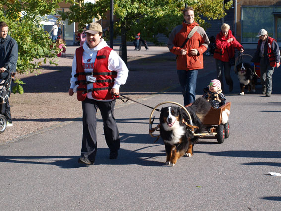 Assi, Ben, Halla, Nuutti ja mää muarostettiin pernien sveittiläisten vetäjien joukkue syyssunnuntaina Viikin Karteniassa vietetyssä Päivä maalla-tapahtumassa. Erellisenä päivänä olis samalle viikollopulle toinenki vetokeikka Espoon Tuamiokirkolle järjestetyillä SyysMatin Markkinoilla. Ajateltiin ton henkilökunnan kanssa, että mulle piisaa nykysin kuitenki yks keikka per viikolloppu. Ja kun olin kerinny maatalousylioppilairen karkeloihin ilmottautua ekana, ni sinne sitten suunnistettiin. Vuarenaikaan nähren sää oli aurinkoisen lämmin. Ei ny ihan hellelukemia, mutta läheltä liippas. Mää hoirin vetovuaroni vanhaan malliin kevyesti ravaten, mikä varmaan lämpösessä säässä aiheutti sen, että mun vetovuarot oli hiukkasen lyhyempiä ku nuaruuren päivinä. Joku siinä vihjailikin, että enköhän mää o jo tähän ikään oman osuuteni vetohommista suarittanu, mutta kyä mää erelleen haluan ja tahron ynnä kykenen osallistuun omalla panoksellani. Tottahan se on, että nuaremmat vetopernien erustajat kantaa keikoilla nykyään suuremman vastuun. Nuarta polvee erusti erittäin kunnioitettavasti Nuutti, joka veteli kärryjä ekalla vetokeikallaan häntä ilosesti heiluen ku vanhempi ammattilainen. Samallaisia otteita kuulu lauantaina harjottaneen Poju, jolle se keikka oli ihka ensimmäinen. Hianoo, että saaraan tuaretta ja innokasta nuarta verta meirän vetotiimiin. Mää ainakin oon ilmottautunu jo seuraavalle vetokeikalle. Ja syyskaurella mulla on verettävänä pari pernien puuhislenkkiäki, tervetuloo mukaan!